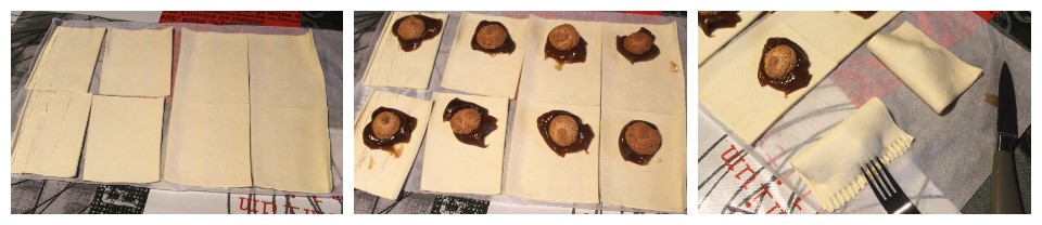Tagliatela in 8 rettangoli; considerando che ogni rettangolo andrà ripiegato a metà, sistemate su ognuno un cucchiaino di crema di marroni tenendosi da una parte, se guardate le fotografie vi sarà molto più chiaro. Sistemate al centro della crema un amaretto e ripiegate la pasta sfoglia fino a racchiudere la farcia di castagne. Con i rebbi di una forchetta sigillate bene i 3 lati.