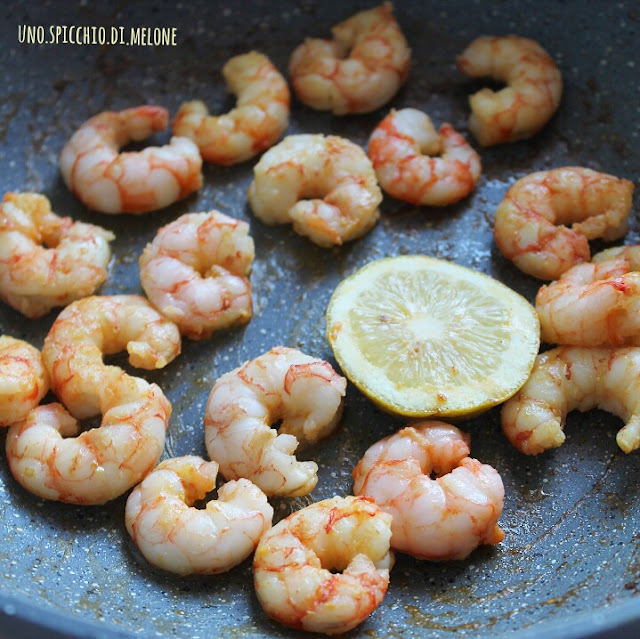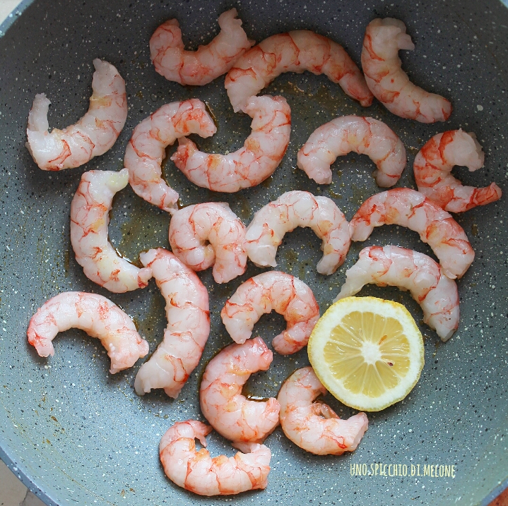 Parallelamente fate saltare in padella i gamberi con un filo d’olio ed eventualmente una fetta di limone.