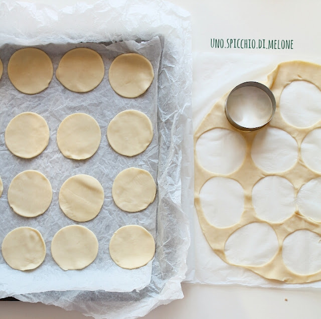 Disponete i cerchi di pasta sfoglia su una teglia da forno rivestita da carta forno ed infornate per circa 15-20 minuti.