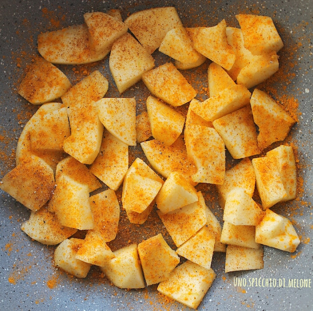 Lavate, detorsolate e tagliate le mele a dadini. Essendo BIO potete utilizzare anche la buccia. Le aggiungete alla pentola antiaderente con un filo d’olio, un pizzico di sale e un cucchiaio raso di curry.