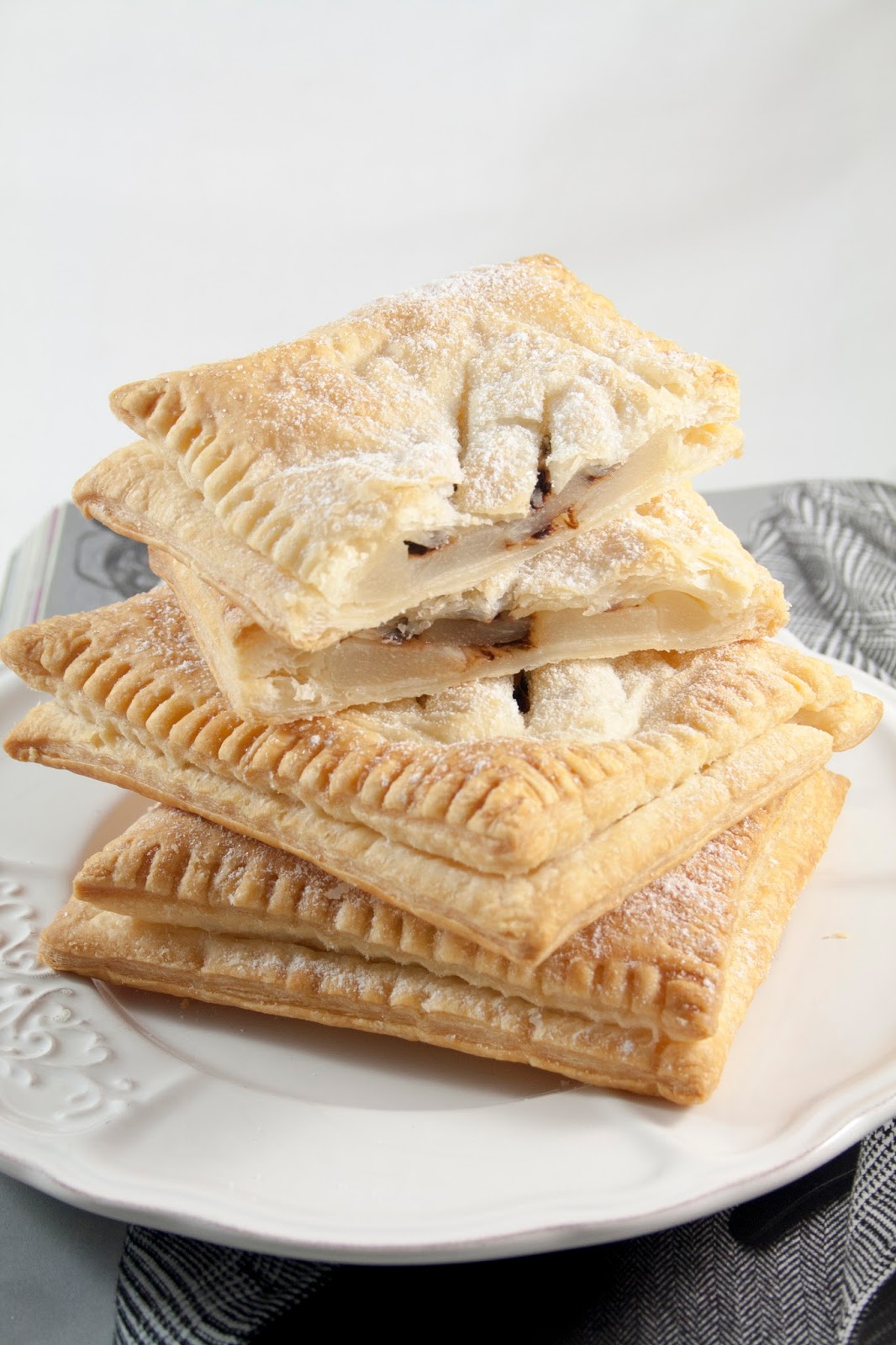 Srotolare la pasta sfoglia e ricavare dei rettangoli, posizionare al centro di ogni rettangolo 3 fettine di pera e 1 cucchiaio di gocce di cioccolato.