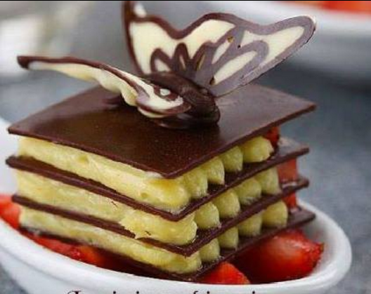 Ingredienti per un piccolo dessert: 50g di cioccolato fondente 130g di mascarpone 1 cucchiaio di panna montata 2 cucchiaidi miele di castagno (o un altro miele aromatico) Zucchero a velo a piacere Noci tritate grossolanamente Procedimento: Fondete il cioccolato a bagnomaria, lasciatelo raffreddare nel pentolino per circa 5 minuti. Quando si è un po’ intiepidito, versatelo su un foglio di carta da forno, mettete sopra un altro foglio e con il mattarello stendete il cioccolato in una sfoglia sottile. Mettete la sfoglia a solidificarsi in frigorifero, controllando di tanto in tanto. Quando si è un po’ rappresa ma è ancora morbida, tagliatela con un coltello affilato: rifilate il perimetro e tagliatela in 4 quadrati della stessa grandezza. Rimettetela in frigorifero. Intanto preparate il ripieno: mescolate il mascarpone con il miele e se lo ritenete necessario aggiungete dello zucchero a velo (secondo me non è necessario), dipende dai vostri gusti! Unite la panna montata e mescolate bene. Versate il ripieno in una sac a poche. Tritate le noci in maniera grossolana. Prendete i quattro quadrati di cioccolato: posizionatene uno su un piatto e ricopritelo con la crema di mascarpone, cospargete un po’ di noci tritate e ricoprite con un pochino di crema di mascarpone. Proseguite così per tutti gli strati. Infondo io ho decorato con un ricciolo di crema e un cuoricino di cioccolato ricavato dalla sfoglia che mi era avanzata..