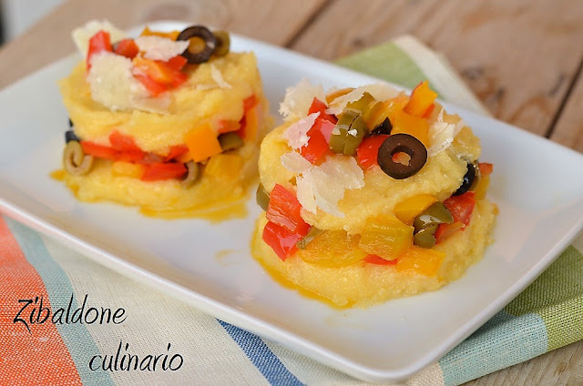 Posizionare un dischetto di polenta, condire con il sugo di peperoni e olive ben caldo, coprire con un secondo dischetto, mettere un cucchiaino di sugo e poi qualche scaglia di grana.