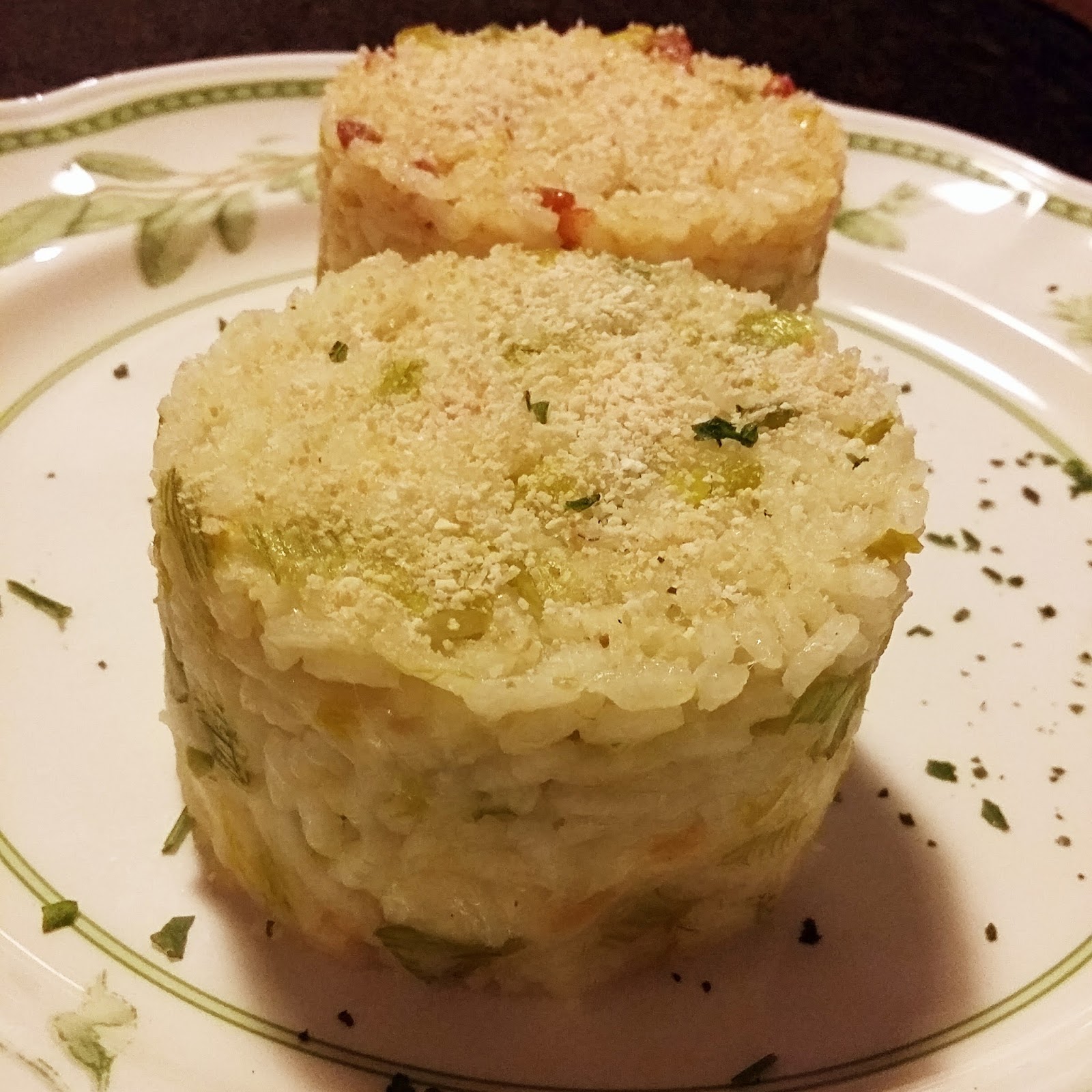 Scolate il riso e unitene una metà alla spianata. Mescolate bene e riempite i coppapasta o i pirottini, in base a quello che avete a disposizione. Io ho usato i primi, più facili da rimuovere. L’altra metà del riso mescolatela con il porro rimasto e la scamorza, anche questa a pezzetti, e usate ovviamente anche in questo caso coppapasta o pirottini per la forma desiderata.