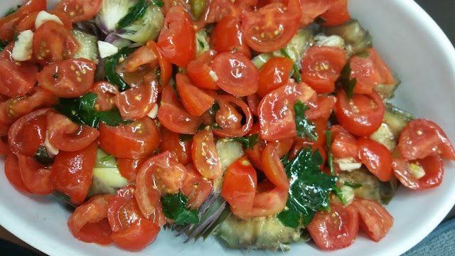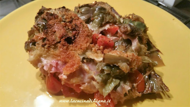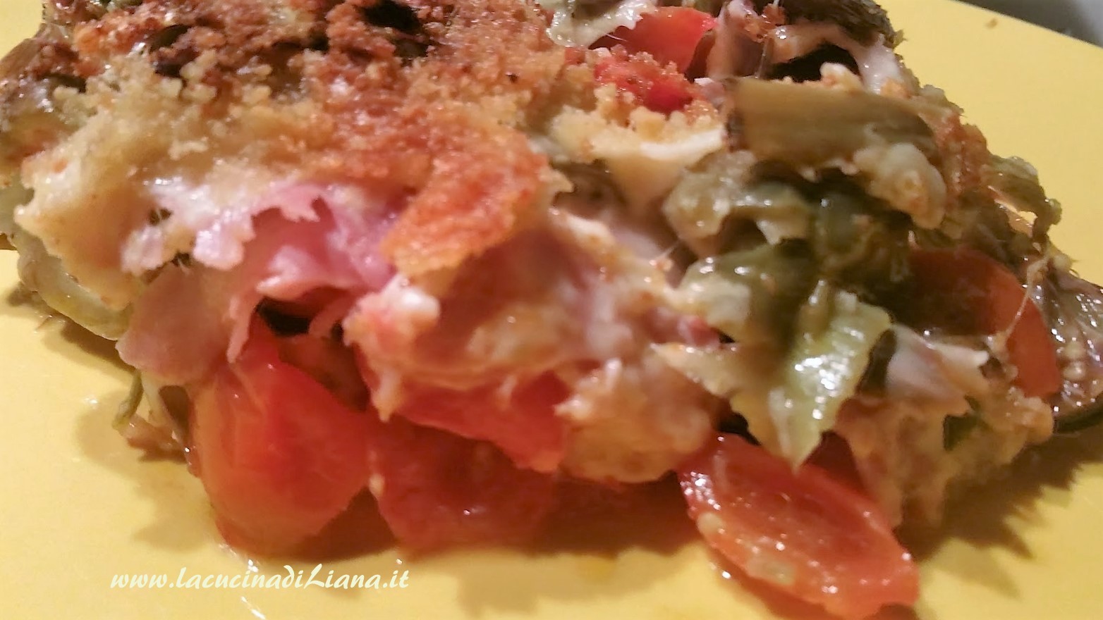 Ricettina light, facilissima da preparare, un piatto unico con carciofi, pomodori, prosciutto e formaggio.