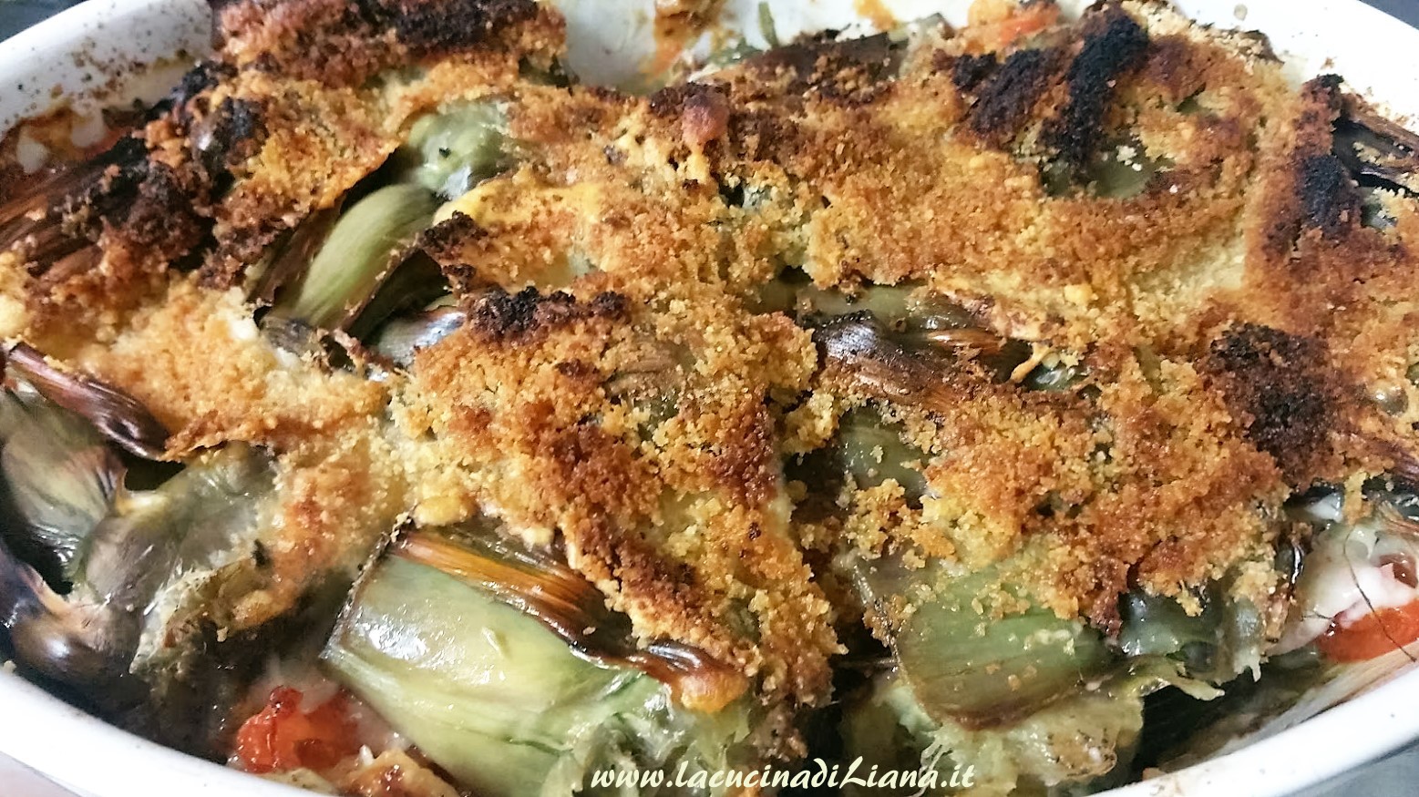 Versare i pomodorini sopra i carciofi, mettere sopra i pomodorini il prosciutto cotto, cospargere di provola a dadini, parmigiano e pepe nero e pangrattato.