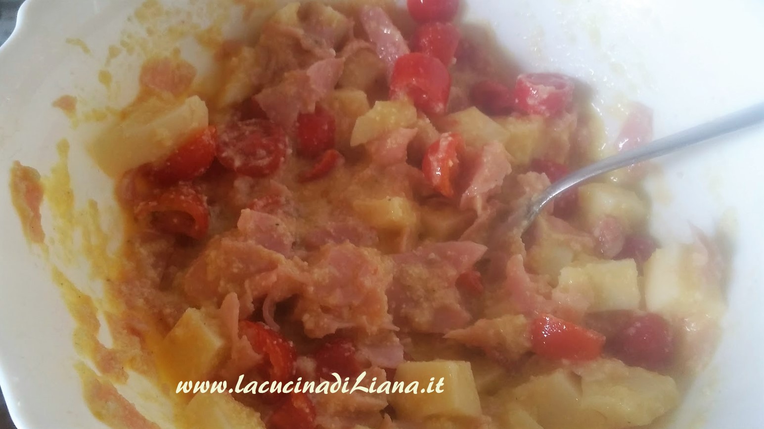 Sbattere le uova con 3/4 del parmigiano, salare, pepare, e aggiungere la mortadella o il prosciutto a dadini o a strisce, il formaggio a cubetti e i pomodori a spicchi. Unire alle melanzane questo composto.