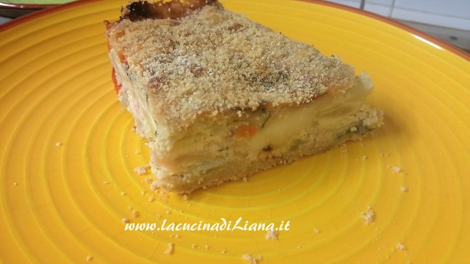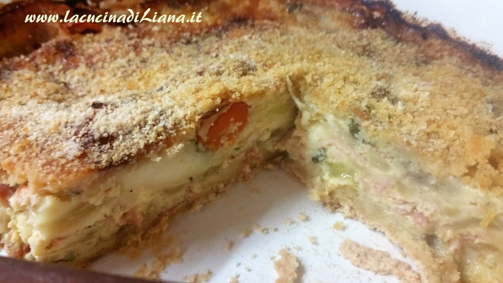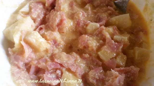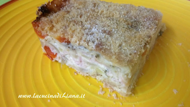 Imburrare una teglia, cospargere il fondo id pangrattato, versarci il composto e livellatelo con un cucchiaio, cospargere di pangrattato e di parmigiano anche la superficie e ricoprirla di fiocchetti di burro.