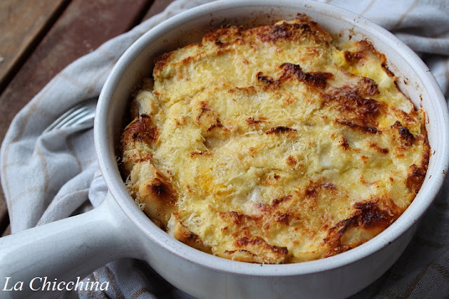 In inverno, preparo spesso questo sformatino: gli ingredienti? Pane raffermo e il formaggio che c’è, anche di diverso tipo, il tutto ammorbidito ed arricchito con un composto di latte, uova e parmigiano… Golosità allo stato puro!