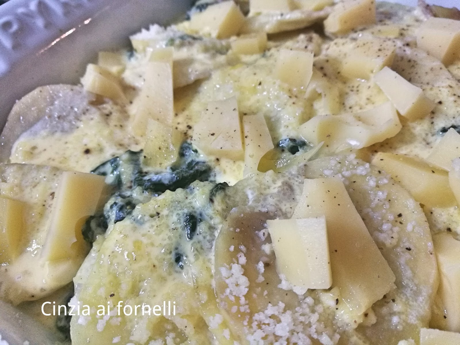 - Disponete gli spinaci a strati in una pirofila, insieme alle patate e condite con sale e pepe.