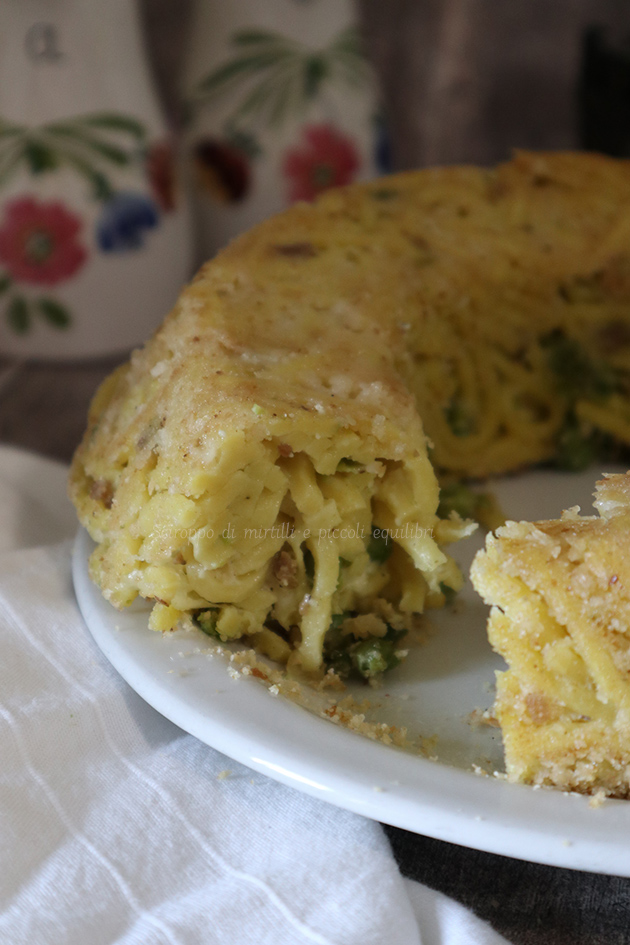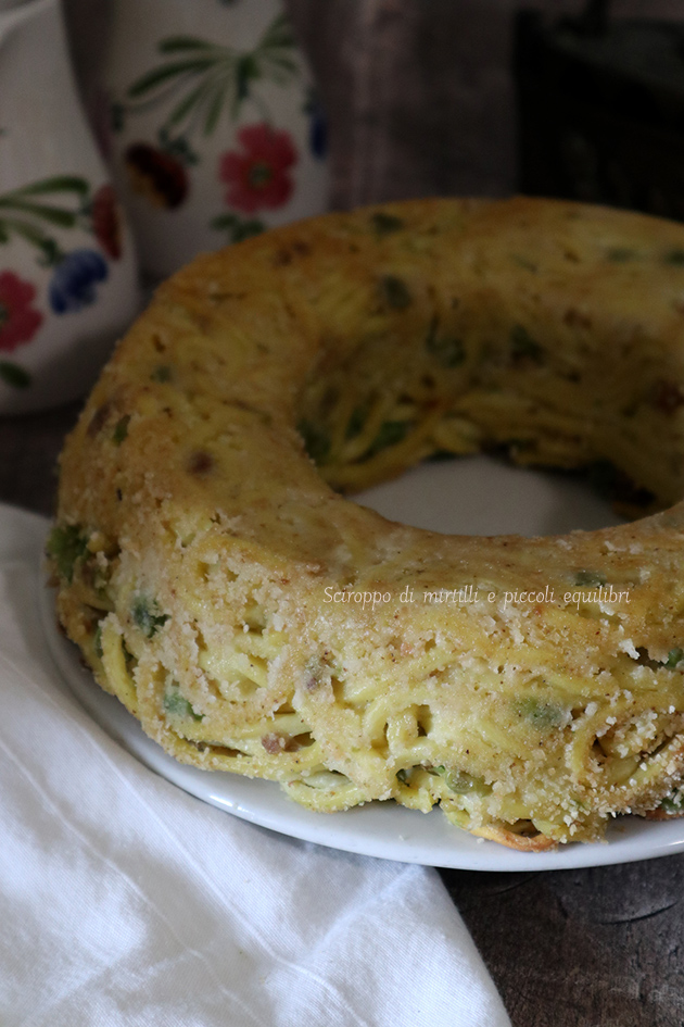 E’ uno sfornato di pasta, per la precisione tonnarelli, condita con piselli, salsiccia e besciamella, il tutto ovviamente cotto in forno. Un primo che sa di domenica e di famiglia.