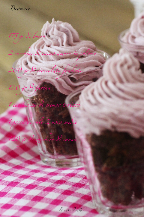 Adoro i brownie e adoro il cioccolato in tutte le sue forme!!!! Erano due settimane che pensavo di preparare questi brownie “al bicchiere” e finalmente l’ho fatto!!! Sono dei piccoli bocconcini sfiziosi e secondo me anche la giusta misura dopo una cena con portate molto abbondanti…dove al dolce non si può rinunciare…mai!!!! Questa idea mi è venuta pensando alle cene che organizzo a casa…sempre molto “piene” e “ricche” di portate e quando si arriva al dolce, non c’è mai spazio e di solito si dà sempre un piccolissimo “morso” al dolce…e sempre a malincuore (perché non si riesce mai a finirlo)…allora con questi brownie “sbriciolati” in piccoli bicchieri ed arricchiti da una ganache al cioccolato bianco e frutti di bosco sono la giusta misura per le cene “ricche”. Potete anche preparare invece che dei brownie dei cupcakes alla vaniglia, al cioccolato e guarnirli con qualsiasi tipo di ganache vi piaccia di più oppure con della crema al burro…