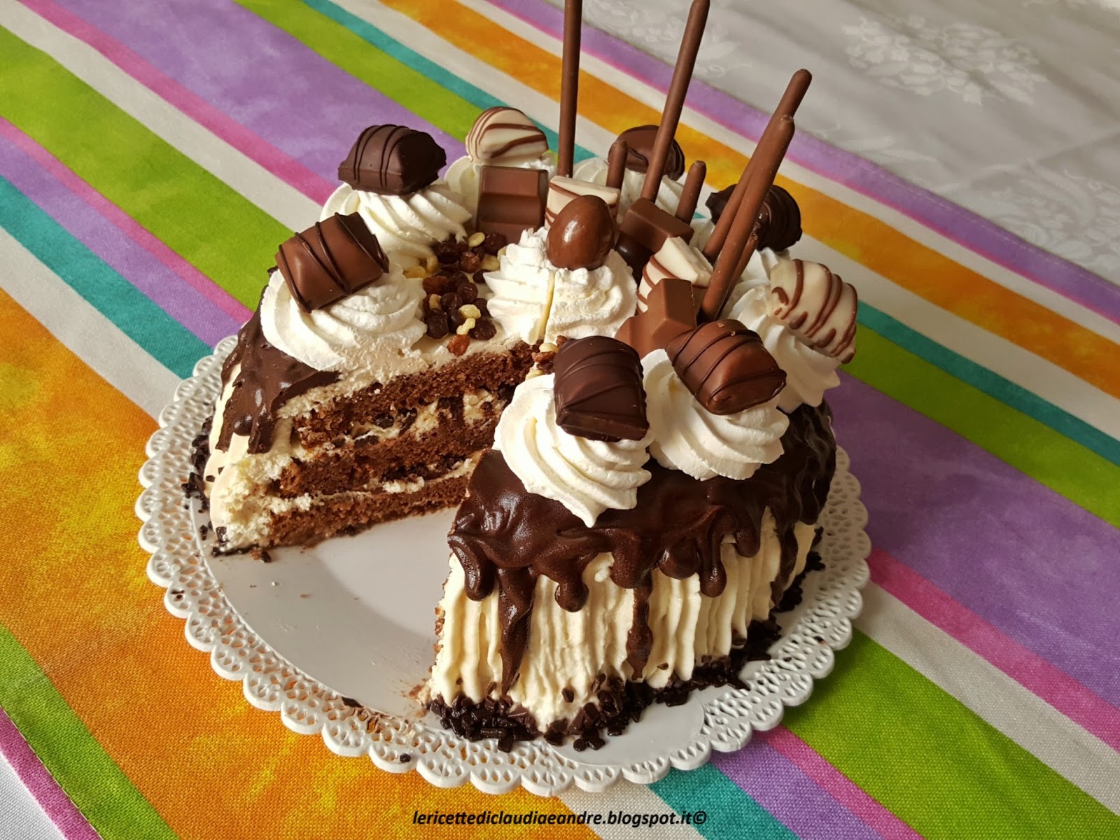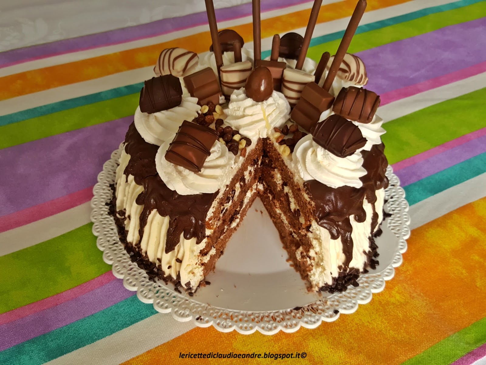 - Fare dei decori con la panna a piacere e sistemare i cioccolatini sopra rendendo la torta golosa.