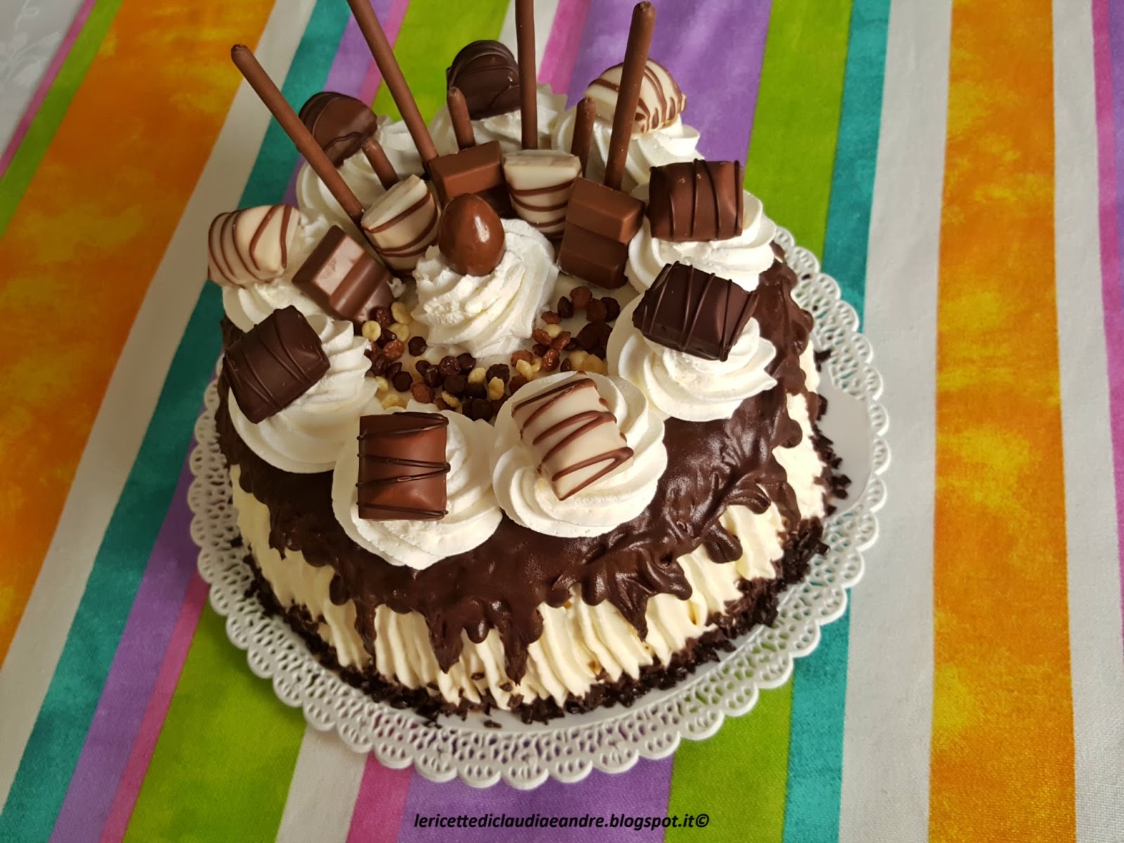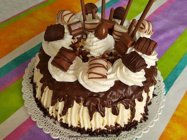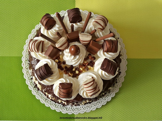 - Fare dei decori con la panna a piacere e sistemare i cioccolatini sopra rendendo la torta golosa.