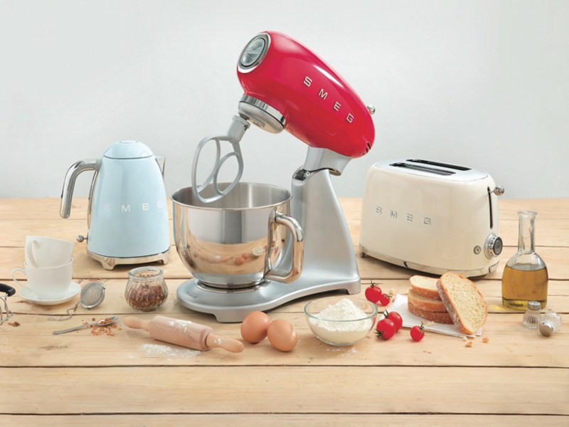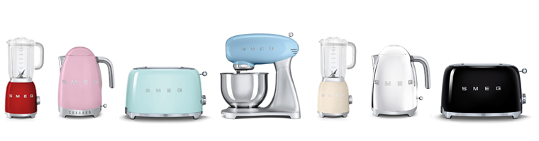La gamma Smeg 50style propone lo spremiagrumi CJF01, la macchina da caffè espresso ECF01, l’estrattore di succo SJF01, l’impastatrice SMF01, il frullatore BLF01, il bollitore elettronico KLF02 e KLF01 e il tostapane a 2 fette TSF01 o 4 fette TSF02 disponibili nei colori nero, panna, rosso, azzurro, rosa, verde acqua e grigio metallizzato (anche se si parla di nuove tonalità in futuro).