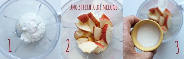 Aggiungete al vostro frullatore lo yogurt, la mela tagliata a tocchetti ed il bicchierino di latte.