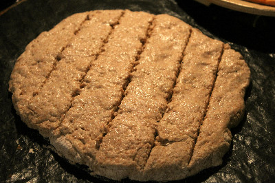 Ho schiacciato la palla così da ottenere una pagnotta larga ma non molto alta, incidete poi la superficie con una lama affilata, io pratico dei tagli obliqui incrociati, a formare una sorta di scacchiera.