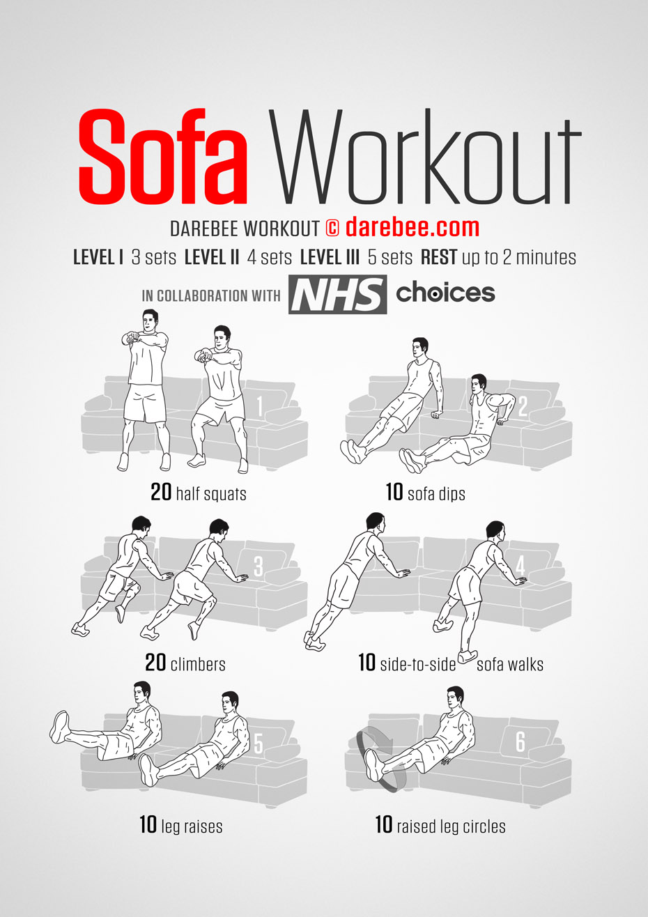 Il programma di allenamento “Sofa workout” arriva dal sito Darebee in collaborazione con il blog dedicato alla salute del Servizio Sanitario Nazionale Inglese NHS Choice, dove vari insegnanti ed esperti suggeriscono esercizi ginnici di tonificazione per mantenere in forma il proprio fisico.