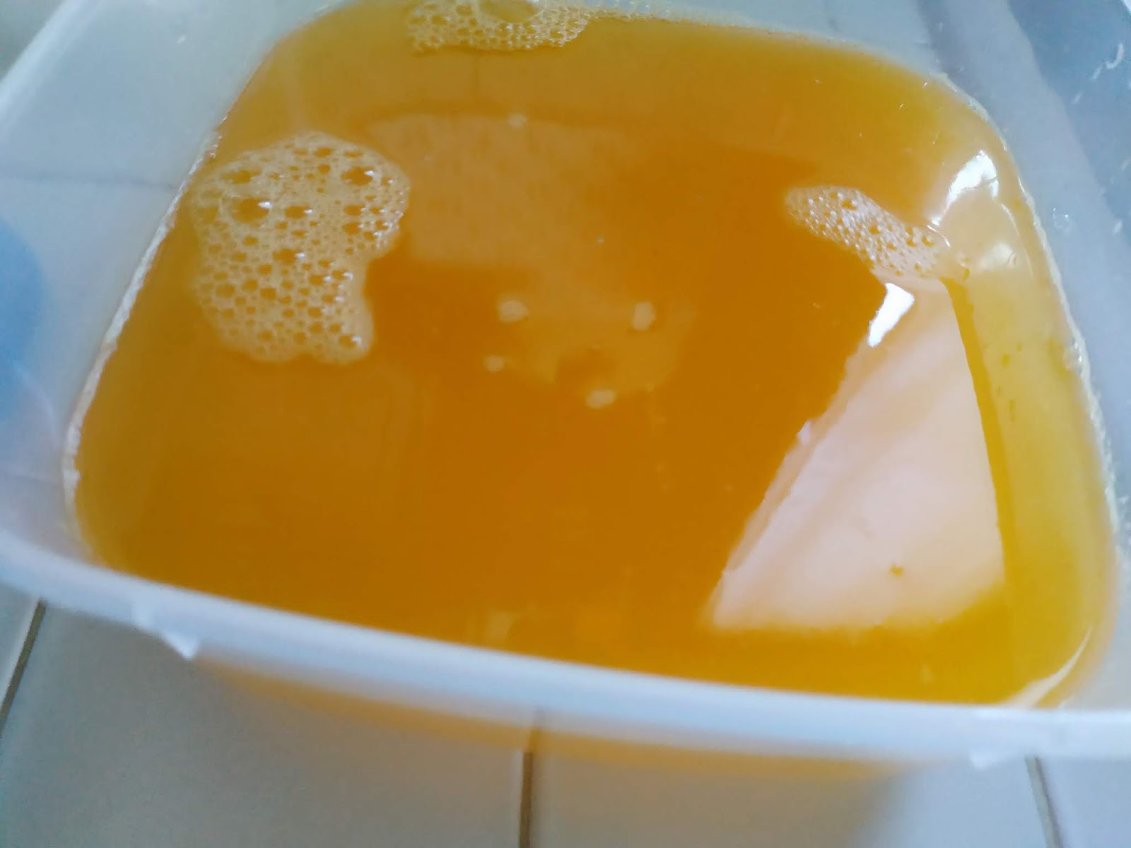 Ho filtrato il succo e ne ho misurato 1 litro. Intanto in un pentolino ho messo 250 ml di acqua con 200 g di zucchero e ho ottenuto uno sciroppo; l’ho fatto raffreddare, unendolo al succo.