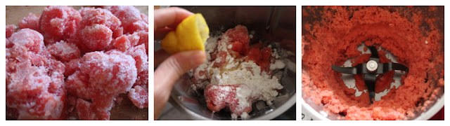 Preparare il sorbetto ora sarà facilissimo, trasferite la polpa congelata in un robot da cucina, nel mio caso il bimby, aggiungete lo zucchero e il succo di limone.