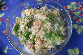 150 gr sorgo decorticato, 4 peperoni verdi, 4 patate piccole, 1 spicchio d’aglio, olio extravergine d’oliva, erbette bio a piacere, 10 noci, sale integrale.