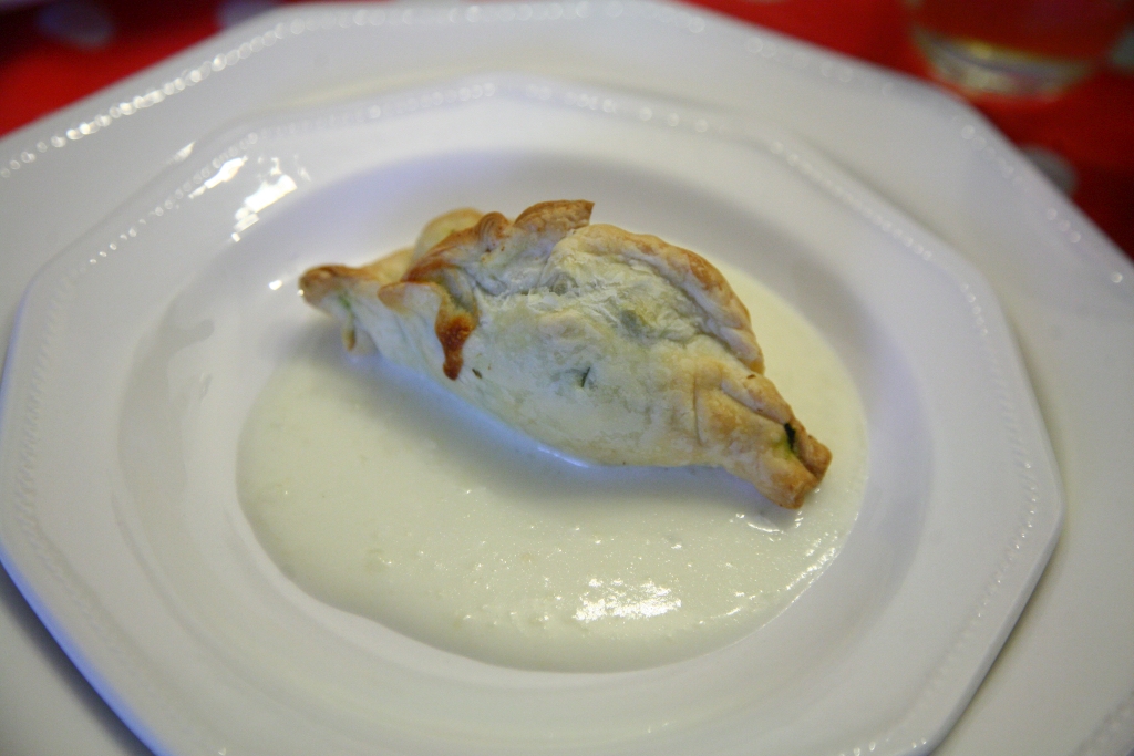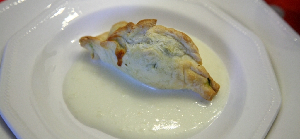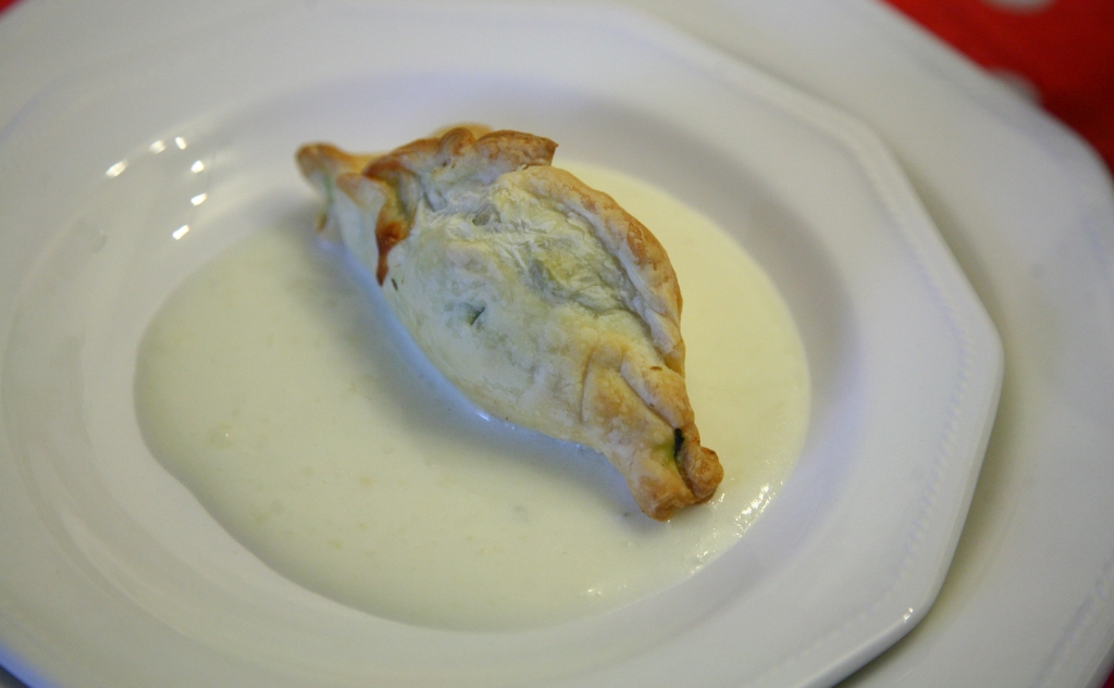 A questo punto prendere un piatto d’antipasto, fare un fondo di crema di Castelmagno, adagiare una sorpresa di sfoglia e servire caldo.