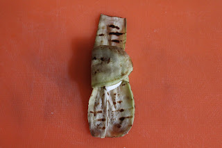 Lavare le melanzane, privarle delle estremità e sbucciarle con il pelapatate (tenere le bucce momentaneamente coperte in frigorifero), tagliarle a fettine sottili e metterle sotto sale a perdere l’acqua.