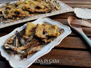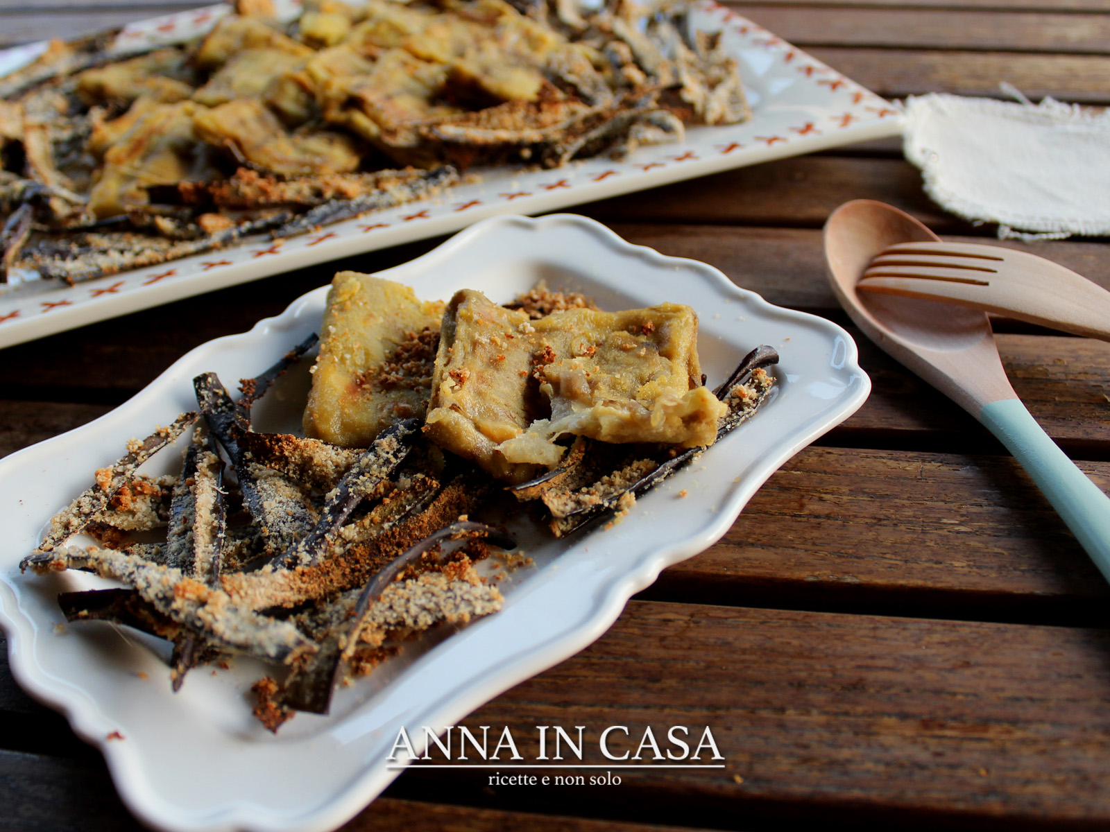 Passare le bucce nell’avanzo di uovo, eventualmente aggiungendo un po’ di latte, scolarle e cospargerle con il pangrattato mescolato al grana e al pepe.