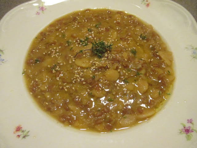 In a large saucepan, sauté with a little oil and carrot, chopped onion and a stalk of celery. Add the vegetable stock, spelled, lentils and beans and cook until optimal cooking. Serve hot with sesame seeds and if you want the fresh thyme.