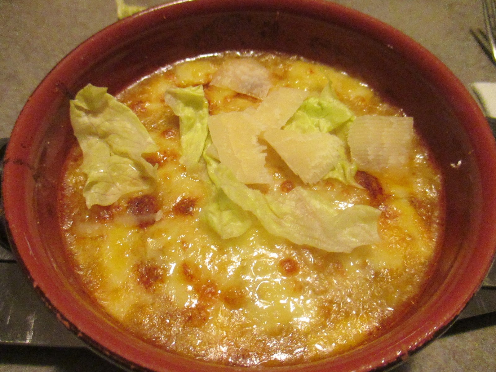 A cooking obtained cut the cabbage into thin strips and diced potatoes. Transfer everything into a pot shard where you made a pan with the oil and garlic. Saute everything well then filled with vegetable stock and cook over medium low heat covered for about 40/50 minutes. When cooked obtained, transferred in earthenware bowls portion that go well the oven and place evenly over each bowl a little fontina cheese, some butter and parmesan. Gratin in oven at 220 degrees for 15 minutes. Serve warm.