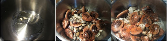In una pentola abbastanza capiente, mettiamo due cucchiai d’olio e gli spicchi d’aglio spellati e schiacciati. Facciamoli rosolare a fiamma dolce e togliamoli appena fatto. Mettiamo le vongole ed i fasolari, alziamo la fiamma al massimo e sfumiamo col vino, aggiungiamo la paprika, mescoliamo quindi copriamole con un coperchio e facciamoli cuocere qualche minuto.