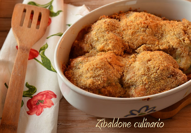 Spolverizzare con il pangrattato avanzato dall’impanatura, versare uniformemente l’uovo sbattuto eventualmente avanzato e infornare per 45 minuti in forno già caldo e 180°C (funzione statico): la crosticina deve essere ben dorata e la carne completamente cotta.