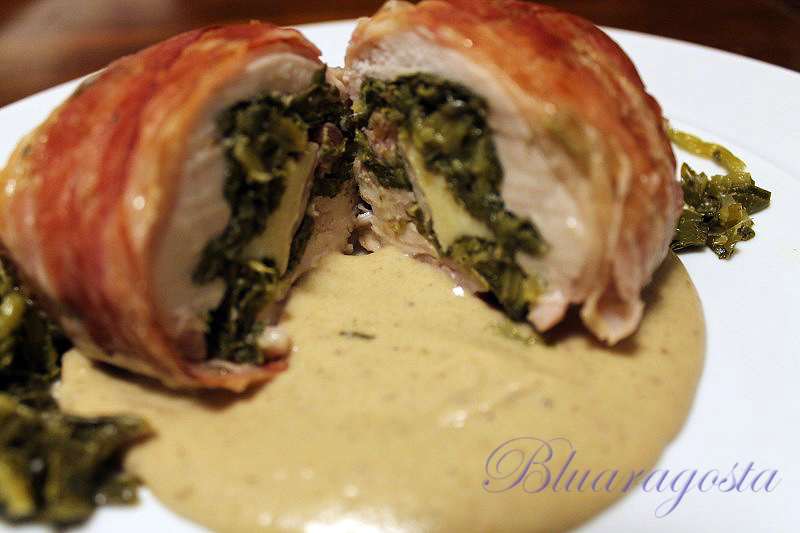 Ed eccoci all’ultima puntata della nostra soap opera! Anche se a dirla tutta ci vuole più tempo a scrivere che a farli, perché ho fatto questo piatto in meno di un’ora, e non è che sia proprio un grande investimento di tempo. Prendiamo le nostre sovracosce, belle aperte, appiattite e rifilate, spruzziamo un pizzico di sale e di pepe, copriamo con una dose generosa di cime di rapa che avevo preventivamente tagliato sottilmente a coltello per avere più agio nella farcitura. Poi mettiamo nel mezzo un rettangolino del nostro formaggio preferito, io avevo il provolone, chiudiamo bene stretto come fosse un involtino stando attenti a non riempirlo troppo se no faremo fatica a chiuderlo. Adesso dobbiamo solo bardarlo con delle fette di pancetta stufata, o lardo, o guanciale, insomma quello che avete in casa o che vi piace, perché il pollo tende ad essere un poco stoppaccioso quindi è meglio bardarlo per renderlo tenero.