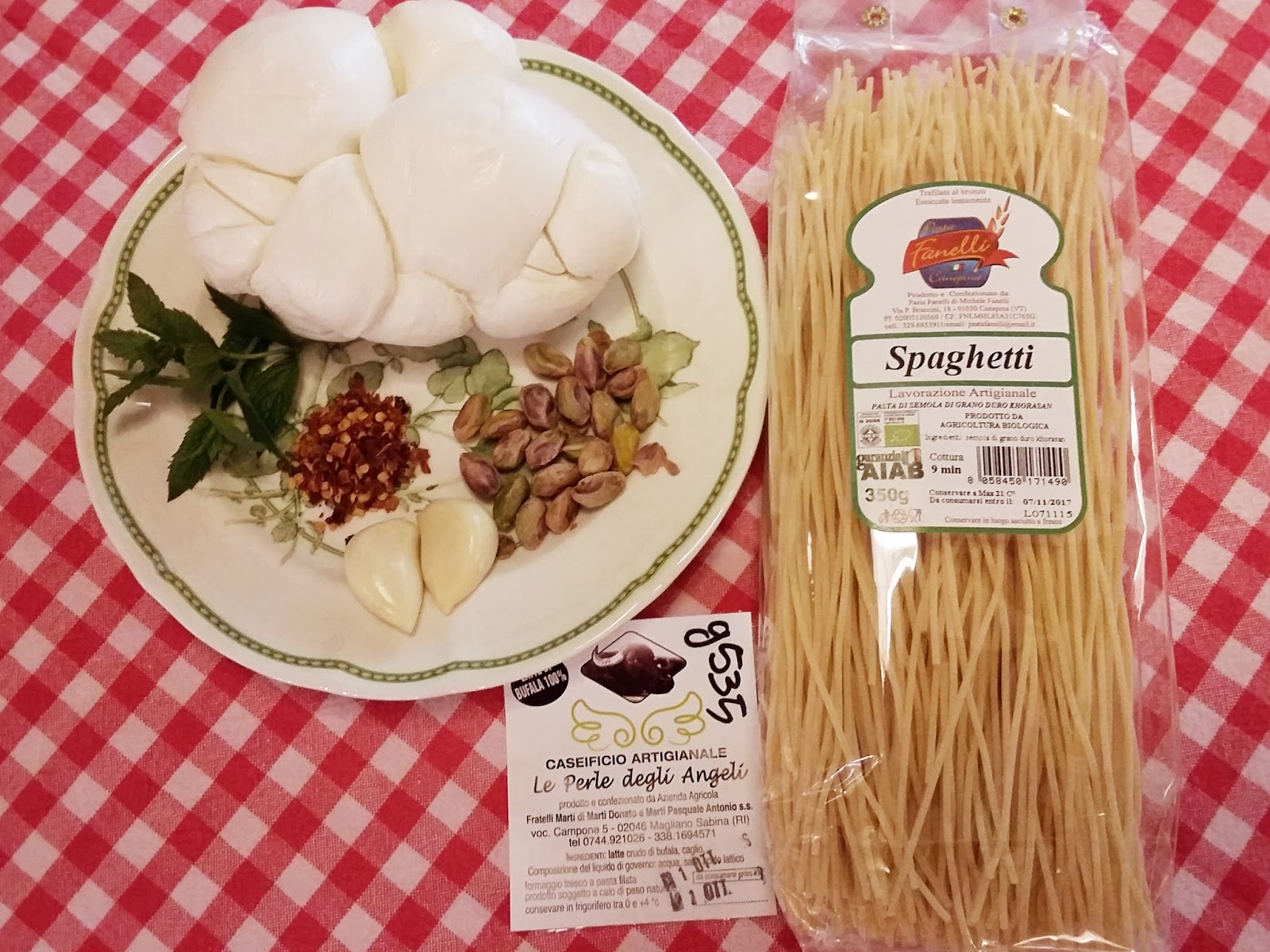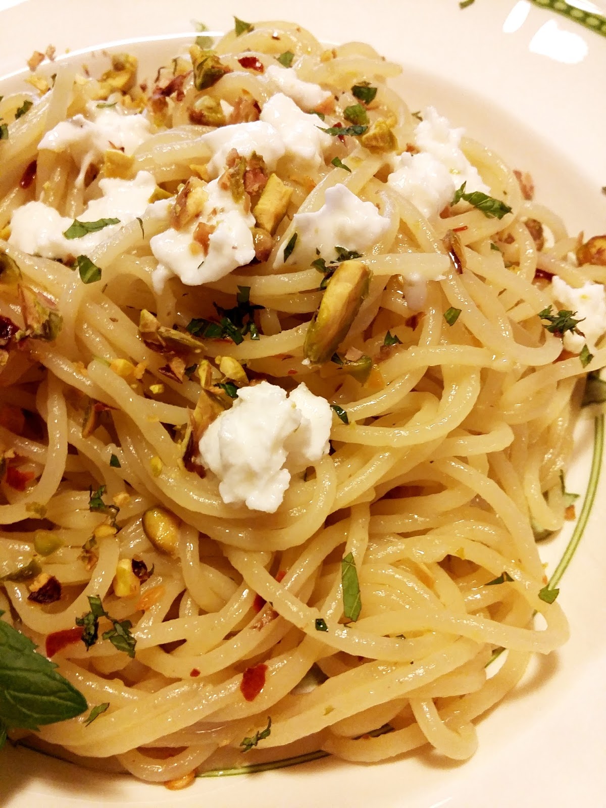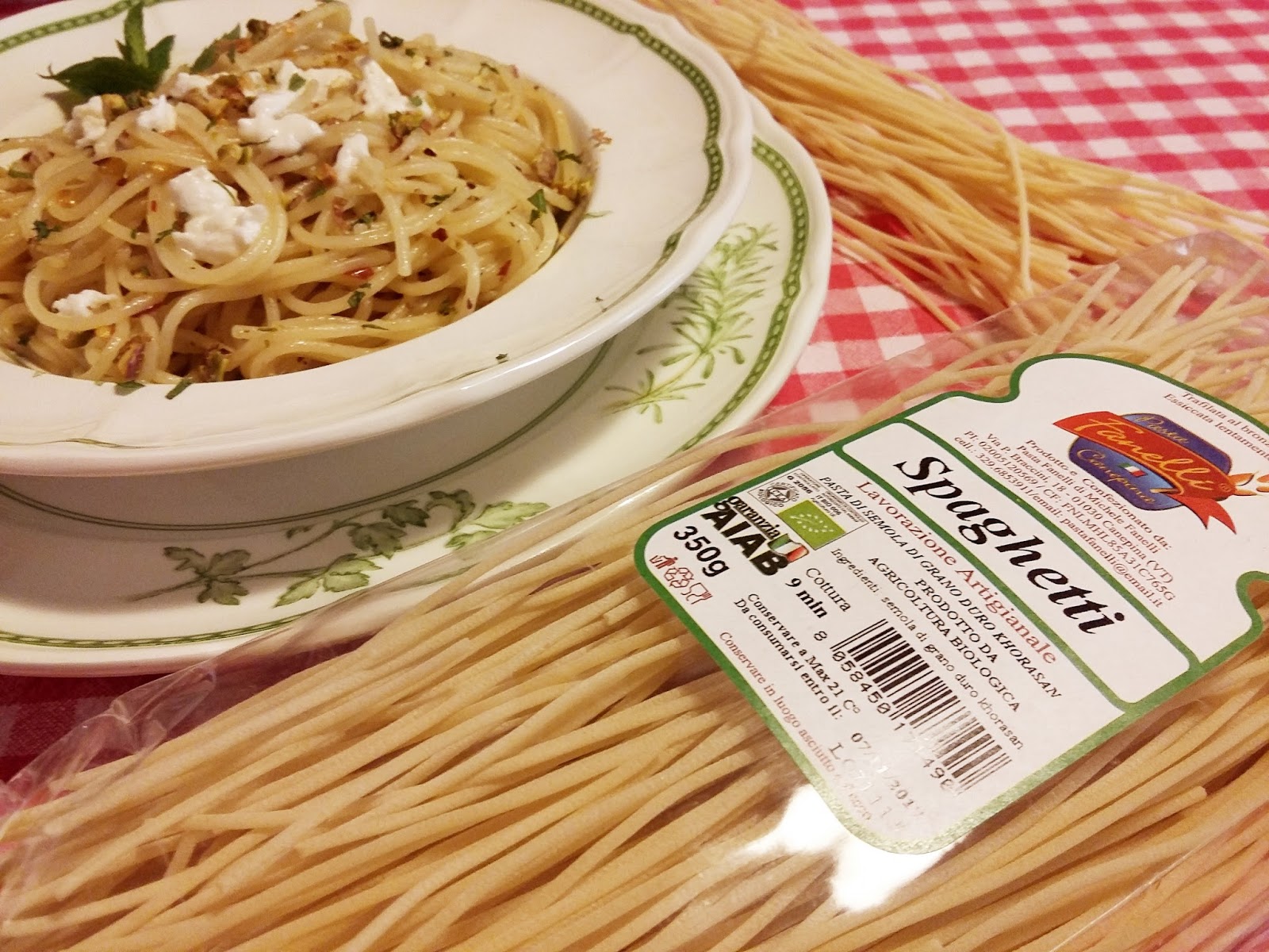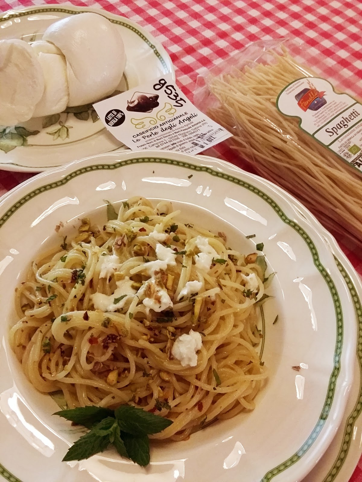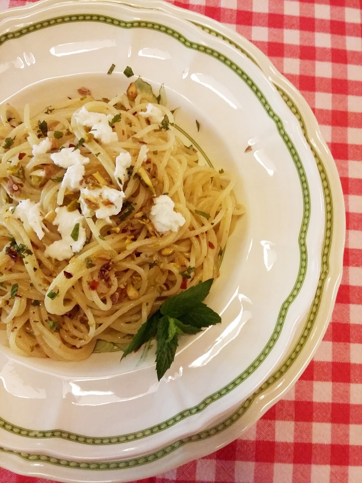 Riuscite ad immaginare come sono? Gli spaghetti ruvidi e consistenti (questi tengono bene il sugo, altro che quelli “famosi”!), il piccante del peperoncino, il fresco della menta, il croccante dei pistacchi, la mozzarella candida e l’olio che unisce tutto… ed un profumo che avvolge ogni cosa. Il tutto in un piatto che si prepara in pochissimo. Vi ho fatto venire fame? A me hanno rubato il piatto prima ancora che finissi di fotografarlo!