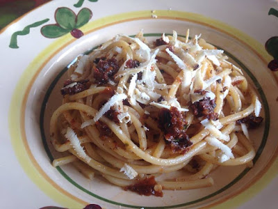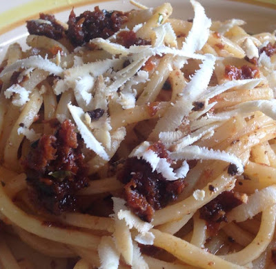 Versate in una padella il pesto di pomodori secchi diluendolo con un pò dell’acqua di cottura della pasta, aggiungete gli spaghetti e mischiate con cura per fargli prendere tutto il condimento. Serviteli con una grattugiata di ricotta salata affumicata.