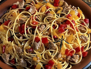 Preparazione: abbrustolire i peperoni, spellarli bene e tagliarli a striscioline e tenere da parte. Soffriggere la cipolla e l’aglio tritati nell’olio, aggiungere l’agnello a dadini e rosolare per 5 m. Fumare con il vino, unire i pelati spezzettati salare e coprire, far cuocere a fuoco moderato per circa 35-40 minuti mescolando ogni tanto. Lessare la pasta al dente senza sgocciolarla tanto e trasferirla nella padella con il sugo, senza la carne, far insaporire per qualche minuto unendo anche i peperoni e il pecorino o parmigiano.