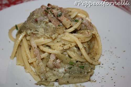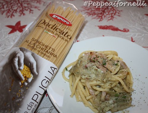 Spaghetti alla chitarra alla gricia con carciofi.