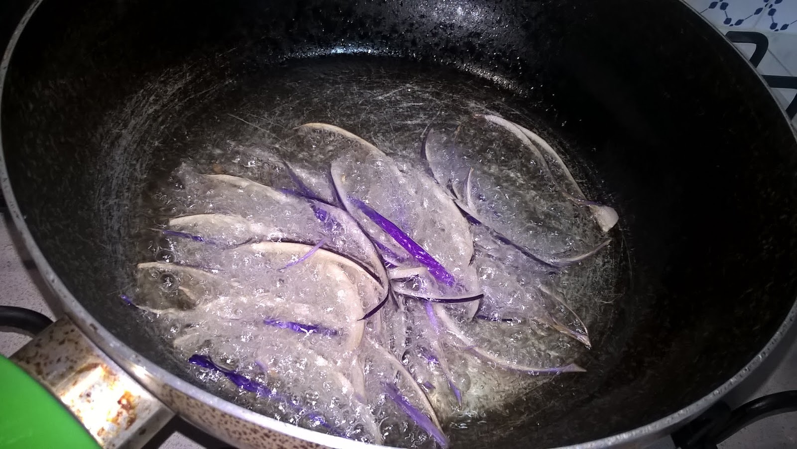 Taglio le melanzane a cubetti, le cospargo di sale in modo che perdano l’acqua di vegetazione, le asciugo e le friggo sempre in olio extravergine.