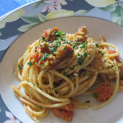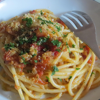 Cuocete gli spaghetti in abbondante acqua salata e scolateli al dente, saltateli in padella aggiungendo un po’ di acqua di cottura della pasta, se necessario, un filo di olio e il pane tostato, facendo attenzione che il tutto non si asciughi troppo e servite.
