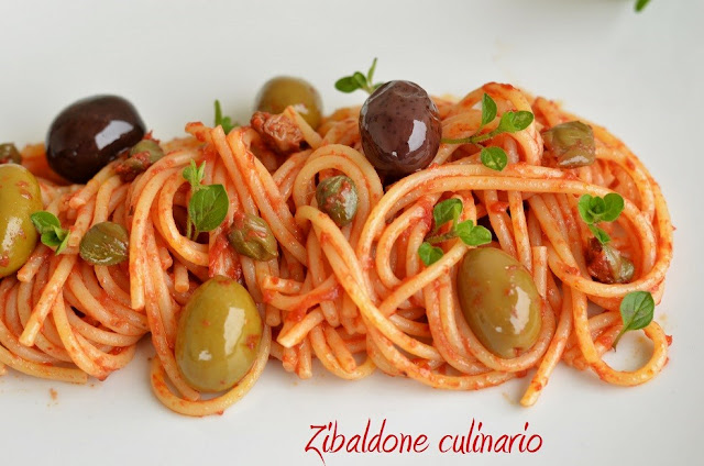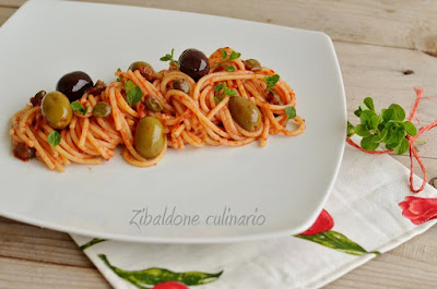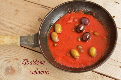 Aggiungere le olive, i capperi ben lavati e il concentrato di pomodoro. Mescolare il sugo e aggiungere un poco di acqua, soprattutto se si usa la passata, le acciughe si scioglieranno, non è quindi consigliato l’uso del sale, mentre utile è lo zucchero per affievolire l’acidità del pomodoro.