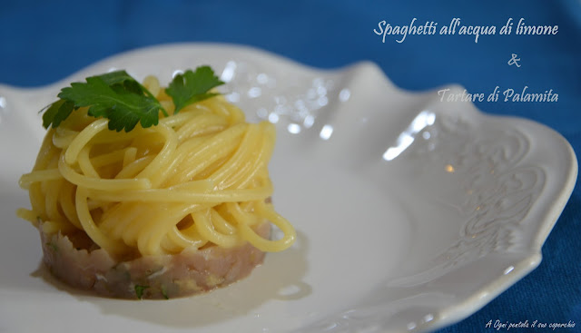 Impiattare con alla base la tartare di palamita e sopra gli spaghetti all’acqua di limone.