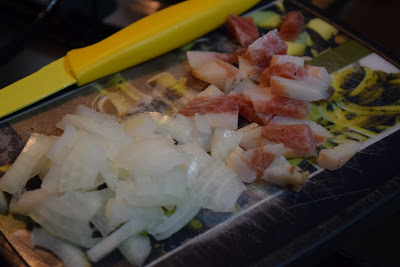 Tagliare finemente una cipolla e il guanciale dopo averlo ripulito dalla cotenna.
