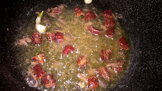 Aggiungete dei pomodori ecchi spezzettati e del peperoncino.