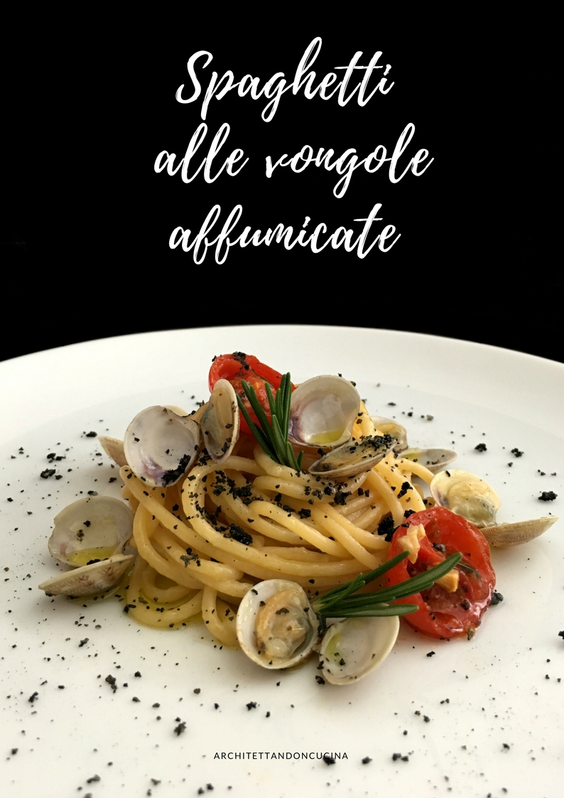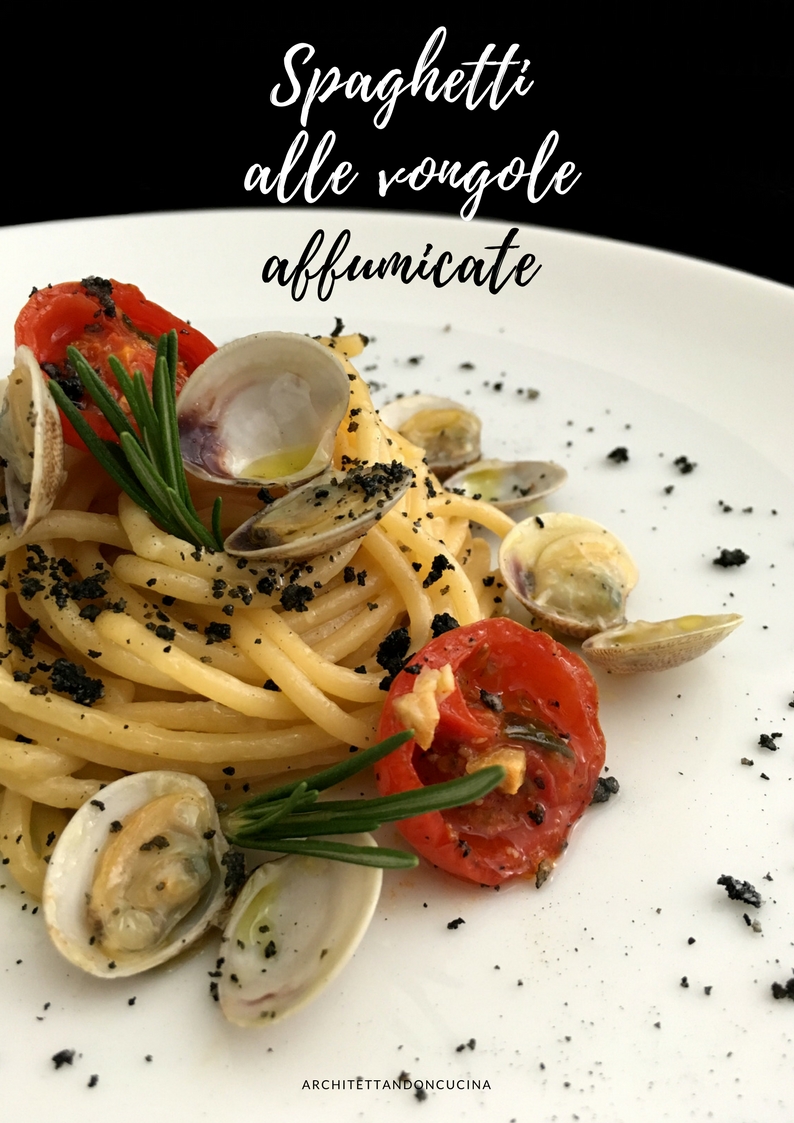 Così ho affumicato le vongole, con le chips di legno di cedro e le foglie essiccate di arance e limoni, ho sostituito il classico soffritto di aglio con la crema di aglio di Vessalico, perché il pungente dell’aglio, temevo prendesse il sopravvento sul gusto affumicato. Invece la crema l’ho fatta con l’aglio cotto in forno che diventa dolcissimo, dona sapore e non prevarica. Ho aggiunto alcuni pomodorini ciliegini per la parte acida e fresca (anche questi asciugati in forno) ed ho finito il tutto con un pane al carbone vegetale tostato in padella, per dare la croccantezza e perchè mi piaceva l’idea di qualcosa che ricordasse il fumo, nella decorazione del piatto. Ho anche guarnito con rosmarino, perché è l’erba aromatica che mi evoca le grigliate e l’odore di fumo.