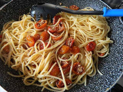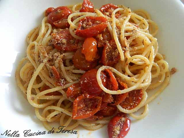 se ce ne fosse bisogno aggiungere un mestolo di acqua di cottura degli spaghetti. Amalgamare gli spaghetti con il condimento per qualche minuto