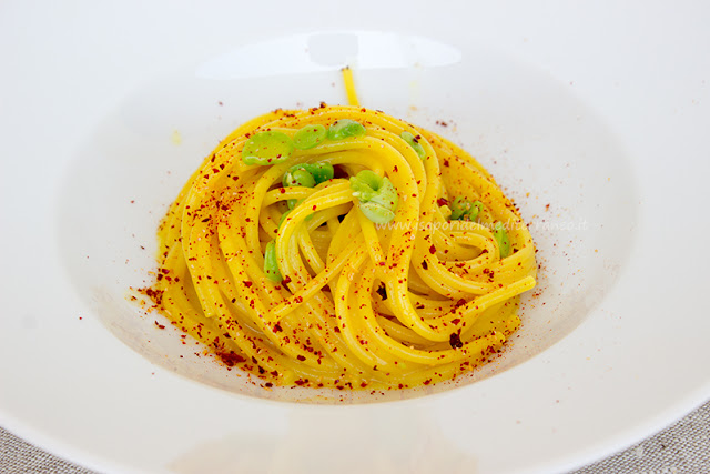 Un piatto di semplice esecuzione, colorato, saporito e con ingredienti di prima qualità. Il profumo caratteristico dello zafferano dell’Aquila Dop, la morbidezza del parmigiano, la dolcezza delle fave e la rusticità del peperone crusco di Senise. “Lo zafferano dell’Aquila Dop è un eccellenza unica e rara che tutto il mondo ci invidia ed è il simbolo dell’Abruzzo. Questa spezia negli anni del secondo dopoguerra è stata salvata e valorizzata grazie all’intuito di Silvio Salvatore Sarra fondatore della Cooperativa Altopiano di Navelli. Grazie a questa cooperativa si è riusciti a salvare la produzione e la presenza dello zafferano nel territorio aquilano.”