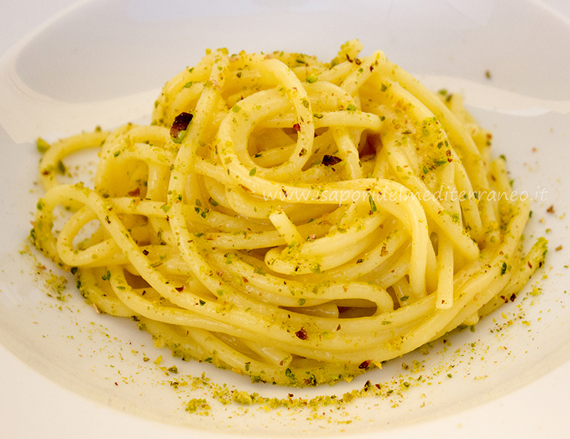 La mattina verso le sette mettete a macerare le scorze di limone (solo la parte gialla, il bianco che è attaccato sotto la scorza renderà il piatto amaro) in acqua calda, va bene quella presa dal rubinetto. Verso la mezza (12:30), togliete le bucce di limone e portate a bollore l’acqua, aggiungete gli spaghetti e un po’ d’olio extra vergine di oliva e cuocete come se fosse un risotto. Aggiungete acqua se c’è bisogno. Terminata la cottura mantecate con il Caciocavallo di Castelfranco in Miscano e ultimate il piatto aggiungendo un filo di olio. Impiattate e guarnite con la granella di pistacchio.