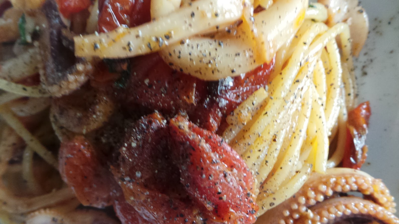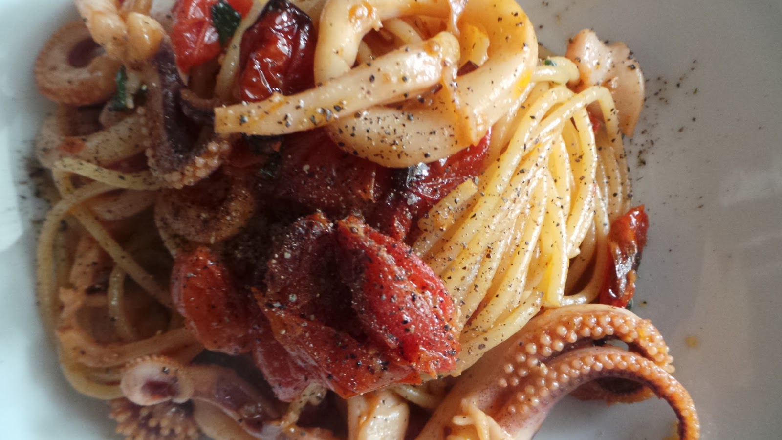 Lessate gli spaghetti al dente,scolateli direttamente nella padella con i calamari dove avrete aggiunto