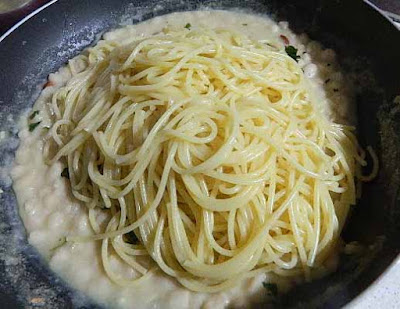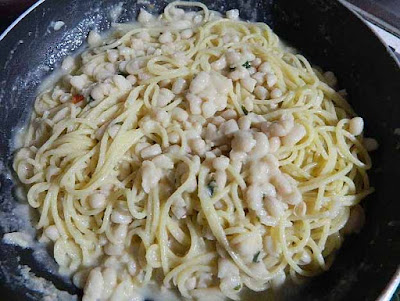 Cuocere gli spaghetti in abbondante acqua e scolarli al dente e versarli direttamente nella padella dei fagioli.