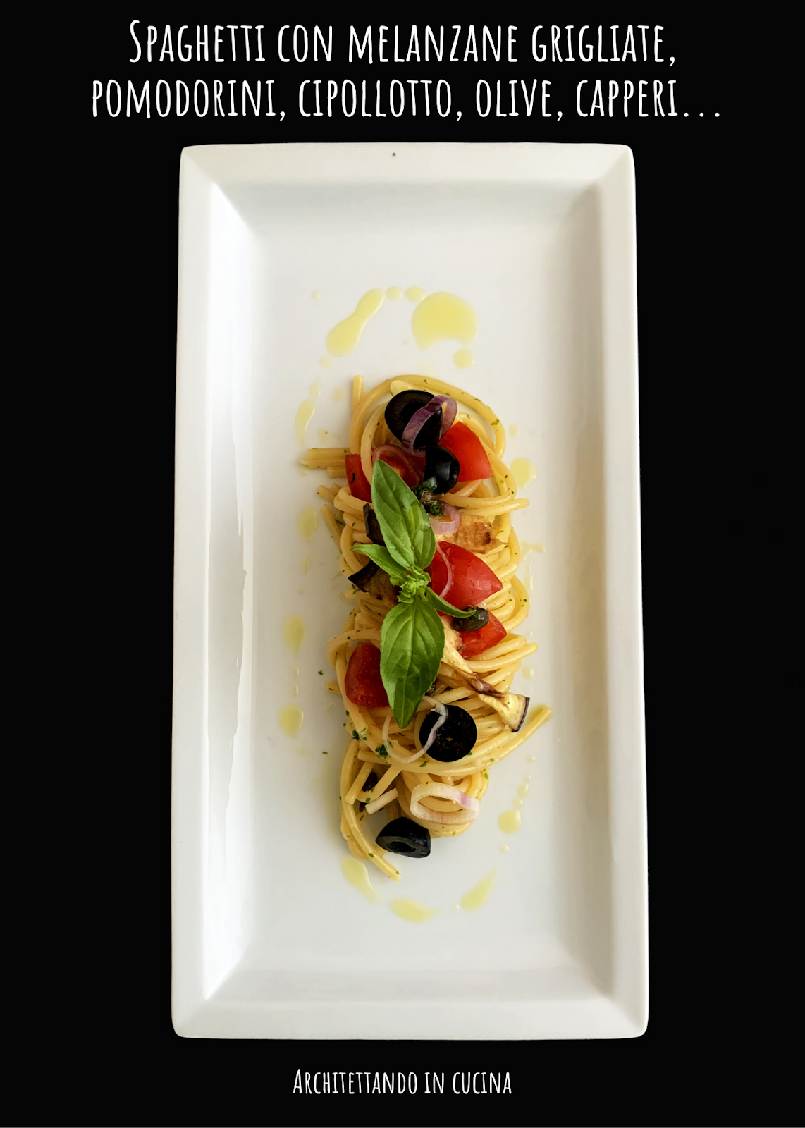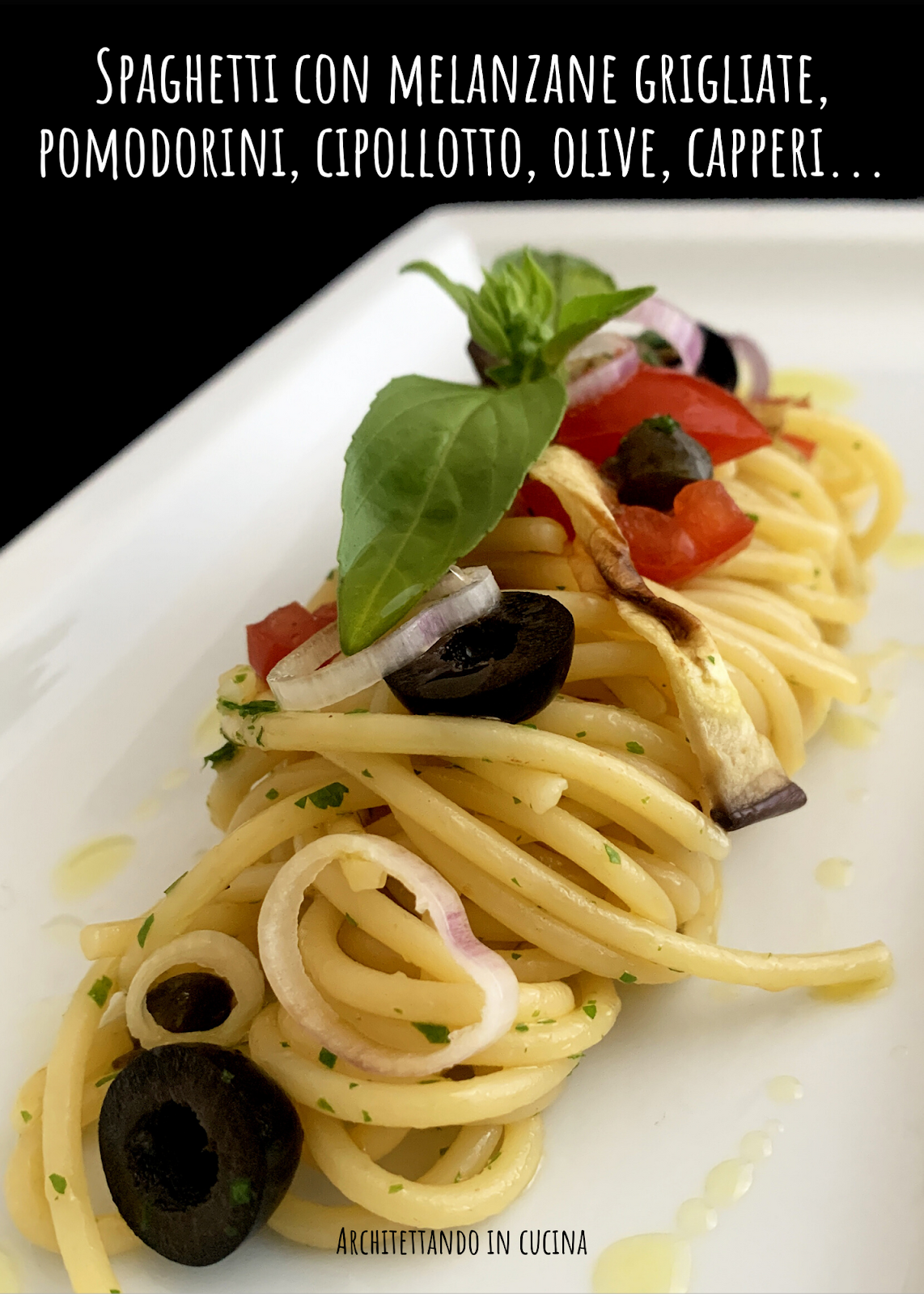 Appena l’acqua bolle salare con 40 g di sale grosso e appena riprende il bollore calare gli spaghetti. Scolarli con il ragno, 2 minuti prima della cottura al dente e passarli in padella con l’aglio e alcuni cucchiai di acqua di cottura della pasta. Mantecare bene aggiungendo acqua se serve. Appena la pasta è mantecata, spegnere il fuoco e aggiungere il prezzemolo, i capperi, le olive, le melanzane ed i pomodorini. Mescolare bene la pasta e servire decorando con basilico e rondelline di cipollotto fresco